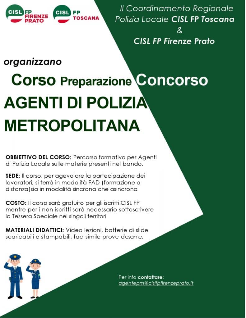 Il Coordinamento Regionale Polizia Locale CISL FP Toscana congiuntamente alla CISL FP Firenze Prato organizzano il corso di preparazione al concorso di Agenti di Polizia Metropolitana, per info ed iscrizioni contattare agentepm@cislfpfirenzeprato.it
