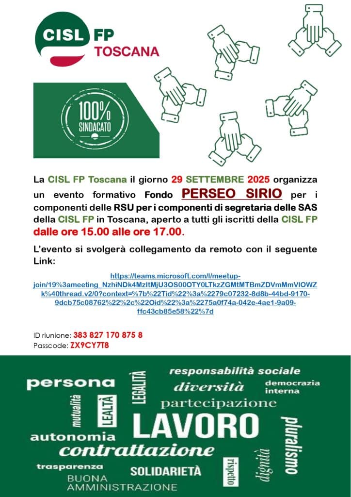 Evento formativo sul fondo PERSEO SIRIO organizzato dalla CISL FP Toscana per il giorno 29 settembre dalle ore 15.00 alle ore 17.00 in modalità videoconferenza per i componenti delle RSU per i componenti di segretaria delle SAS della CISL FP in Toscana, aperto a tutti gli iscritti della CISL FP.
