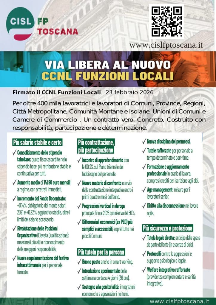 Rinnovato oggi 23 febbraio 2026 il contratto per oltre 400 mila lavoratrici e lavoratori di Comuni, Province, Regioni, Città Metropolitane, Comunità Montane e Isolane, Unioni di Comuni e Camere di Commercio . Un contratto vero. Concreto. Costruito con responsabilità, partecipazione e determinazione.
