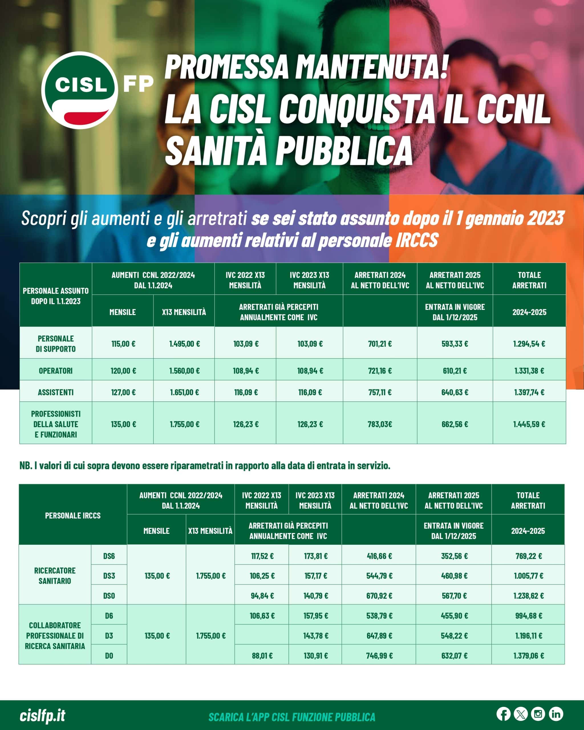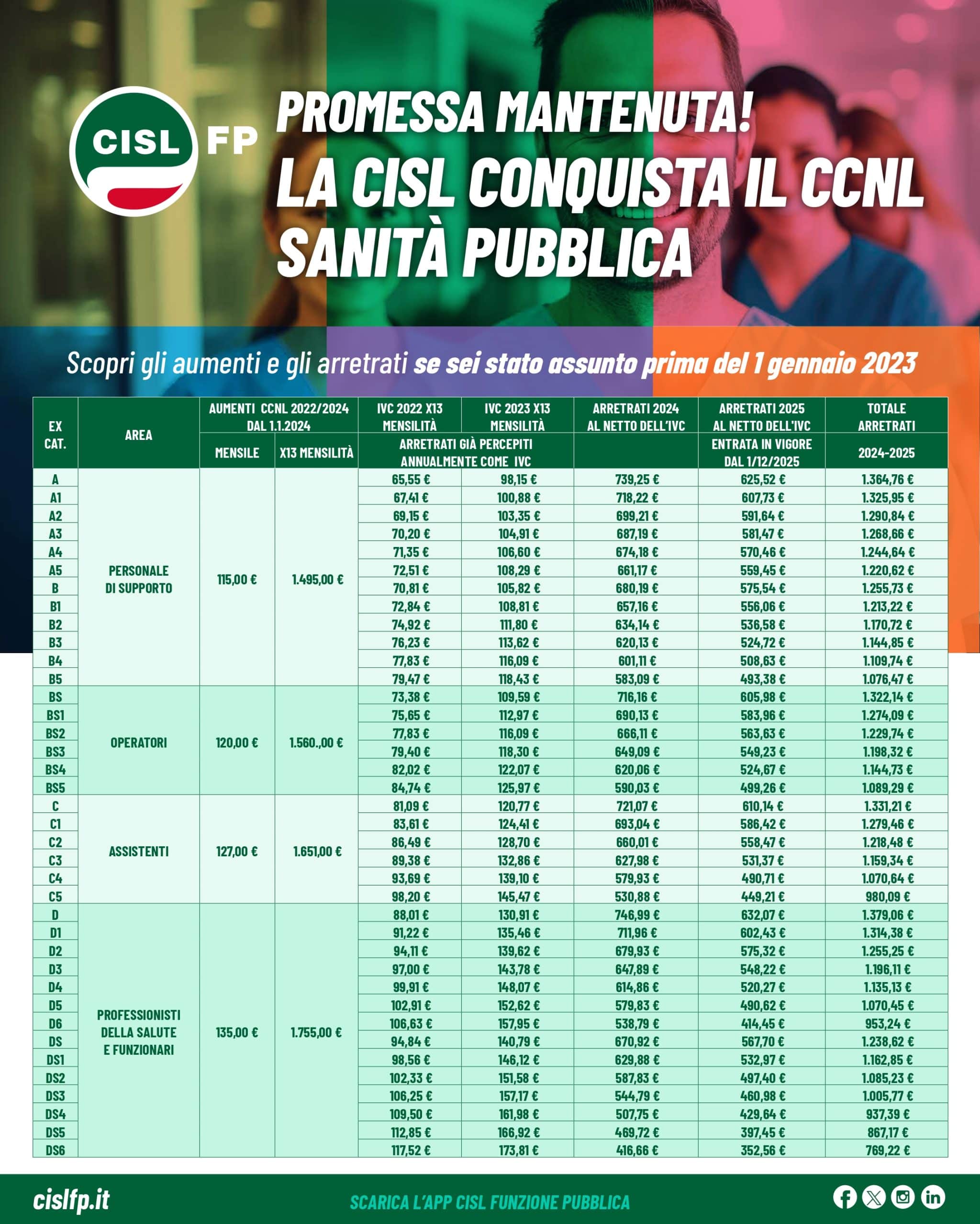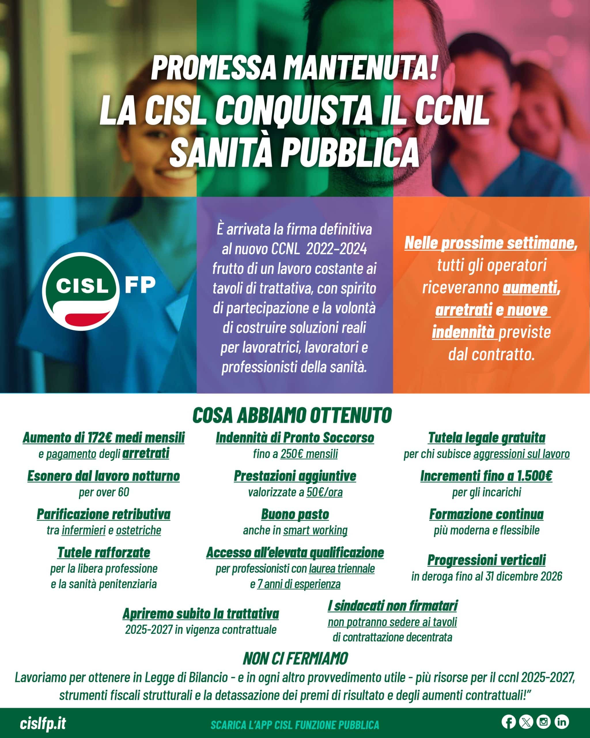 Come CISL FP abbiamo sottoscritto l’Ipotesi di CCNL 2022/2024 per il personale del comparto Sanità, una firma importante, che restituisce finalmente certezze e tutele economiche e normative ai circa 600mila lavoratrici, lavoratori e professionisti del nostro Servizio Sanitario Nazionale. Questo contratto contiene risultati importanti: aumenti in busta paga di 172€ medi, arretrati, nuove indennità, tutele professionali e valorizzazione concreta del lavoro nei servizi sanitari di frontiera